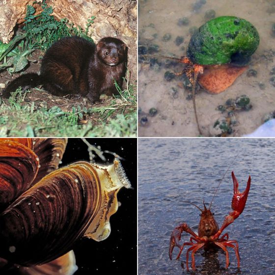 Arriba, visón americano y caracol manzana. Abajo, mejillón cebra y cangrejo americano. / C. SANZ / J. LL. SELLART / R. DIRSCHERL / REUTERS